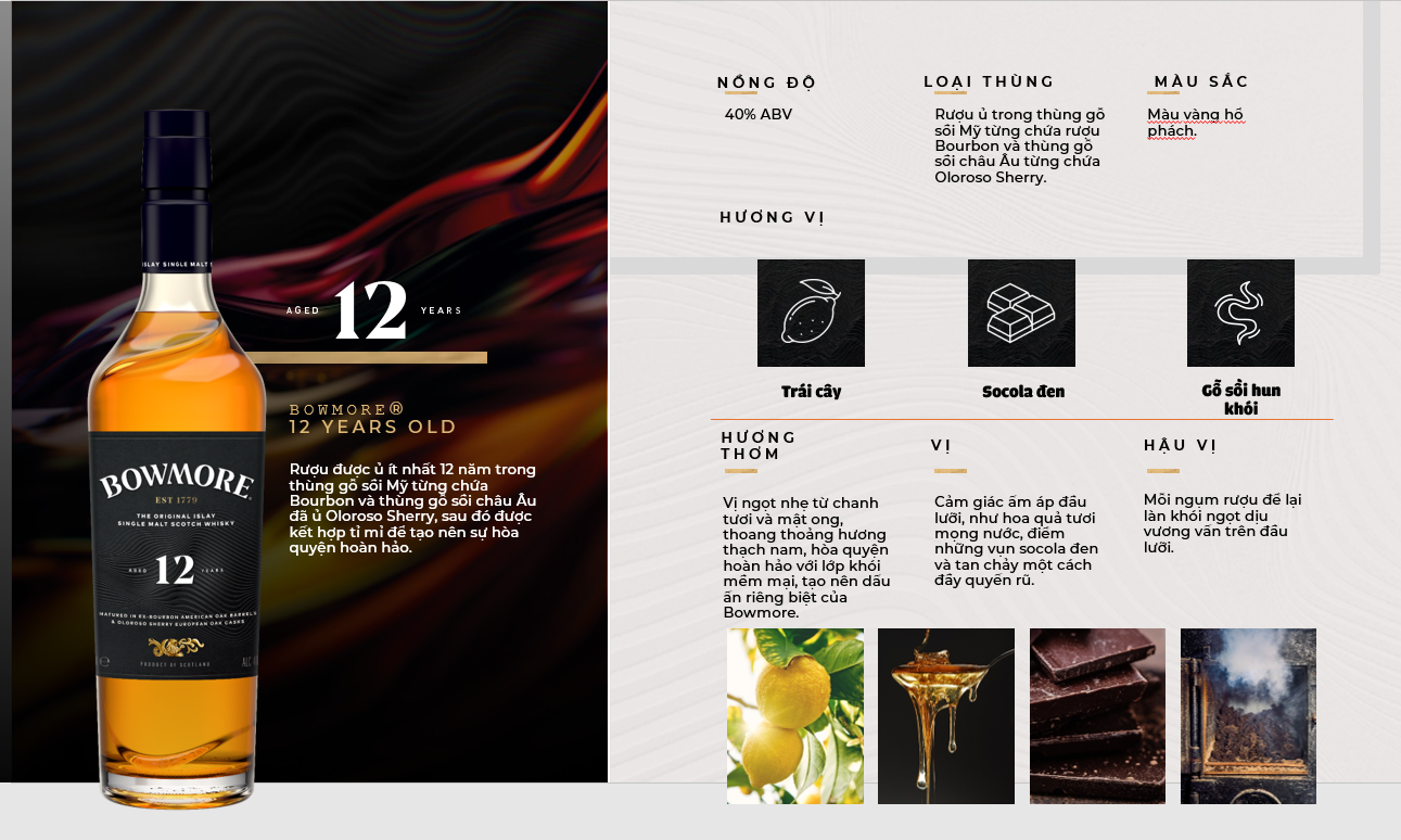 Hương thơm: Vị ngọt nhẹ từ chanh tươi và mật ong, thoang thoảng hương thạch nam, hòa quyện hoàn hảo với lớp khói mềm mại, tạo nên dấu ấn riêng biệt của Bowmore.