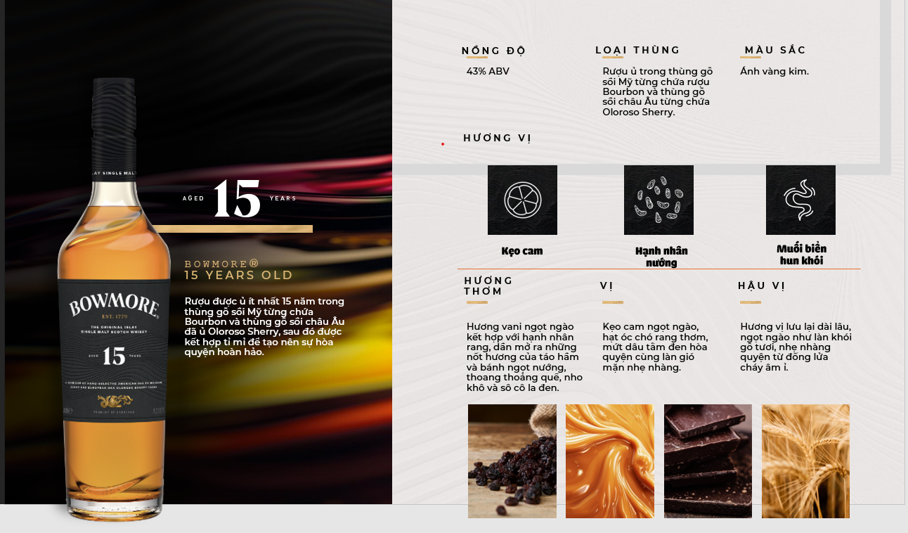 Rượu Bowmore 15 Năm Classic được ủ ít nhất 15 năm trong thùng gỗ sồi Mỹ từng chứa Bourbon và thùng gỗ sồi châu Âu đã ủ Oloroso Sherry, sau đó được kết hợp tỉ mỉ để tạo nên sự hòa quyện hoàn hảo.