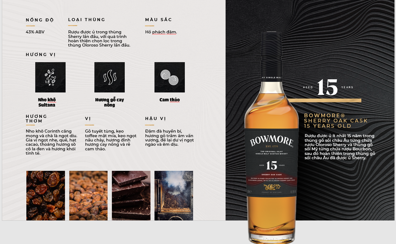 Rượu Bowmore 15 Năm Sherry Oak Cask được ủ ít nhất 15 năm trong thùng gỗ sồi châu Âu từng chứa rượu Oloroso Sherry và thùng gỗ sồi Mỹ từng chứa rượu Bourbon, sau đó hoàn thiện trong thùng gỗ sồi châu Âu đã được ủ Sherry.